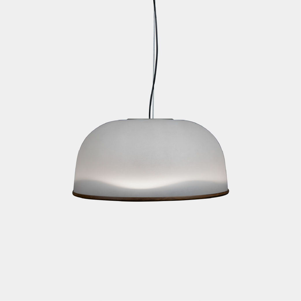 以台灣口吹玻璃工藝製作,透過光學及結構設計出光,使玻璃材質展現晨曦柔和的光與影。玻璃、木頭的異材質搭配如天與地,將晨間寧靜的山陵線轉譯成為淺淺波浪,透過玻璃隱約透出的柔光,呈現美好光景。